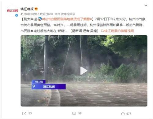 7月17日下午2點39分,杭州市氣象臺發(fā)布暴雨黃色預(yù)警,讓人們提前做好防范措施。然而,暴雨過后的一幕讓杭州市民和游客大吃一驚:保俶路路面如桑拿一般,熱氣騰騰,仿佛大地正在燃燒。