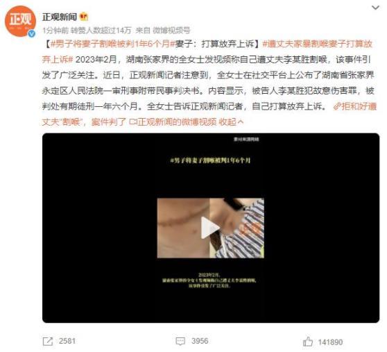 【重要案件】2023年2月,湖南張家界發生了一起引發廣泛關注的事件,全女士發布了一段視頻聲稱自己遭受丈夫李某勝割喉。最近,正觀新聞記者注意到,全女士在社交平臺上公布了湖南省張家界永定區人民法院對李某勝的一審刑事附帶民事判決書。根據判決書內容顯示,李某勝被判犯有故意傷害罪,判處有期徒刑一年六個月。全女士告訴正觀新聞記者,她打算放棄上訴。