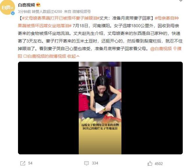 近日,河南濮陽發(fā)生了一起令人心疼的故事。一位女子嫁給了一個(gè)位于1800公里之外的地方,當(dāng)她收到母親寄來的食物時(shí),卻發(fā)現(xiàn)食物已經(jīng)損壞,于是她坐在地上流下了悲傷的眼淚。女子的丈夫趙先生介紹說,這些食物是他們家自己種植的,快遞運(yùn)送了大約3天時(shí)間。妻子打開包裹時(shí),一開始還很開心,但當(dāng)看到腐爛的梨后,她忍不住落淚了。看到妻子流淚,趙先生也感到非常心痛,計(jì)劃在月底帶妻子回家看望父母。