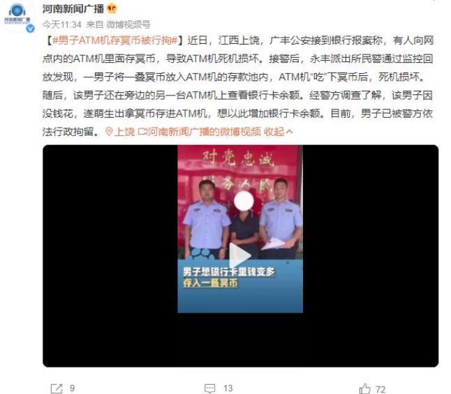 近日,江西上饒廣豐公安接到一起銀行報(bào)案,稱有人將冥幣存入ATM機(jī)導(dǎo)致機(jī)器死機(jī)損壞。接警后,永豐派出所民警通過監(jiān)控回放發(fā)現(xiàn),一名男子將一疊冥幣放入ATM機(jī)的存款池內(nèi),導(dǎo)致機(jī)器死機(jī)。隨后,該男子還在旁邊的另一臺(tái)ATM機(jī)上查看銀行卡余額。經(jīng)警方調(diào)查了解,男子因?yàn)闆]有錢可花,便產(chǎn)生了將冥幣存入ATM機(jī)以增加銀行卡余額的想法。目前,警方已依法對(duì)男子進(jìn)行行政拘留。