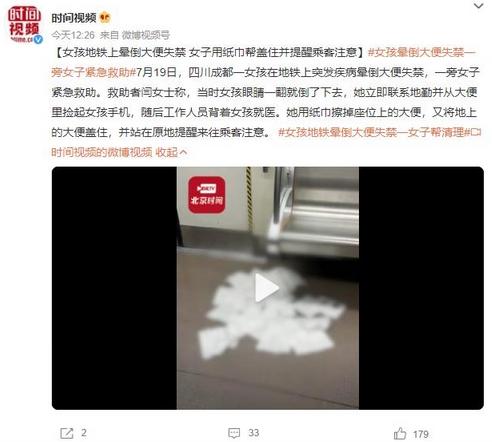 7月19日,發生在四川成都地鐵上的一幕引起人們的關注。一名女孩在車廂內突發疾病,暈倒并失禁,形勢十分緊急。幸好,一位好心的女士閆女士及時伸出援手。她目睹女孩暈倒后立即聯系了地鐵工作人員,并在女孩失禁后幫忙清理現場,將女孩手機從大便中撿起,并隨后與工作人員一同攙扶女孩前往醫院就醫。