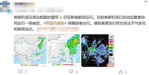 7月22日,據首都機場微博消息,首都機場及周邊航路的雷雨天氣仍在影響航班運行。為了保障旅客出行安全,首都機場已啟動運管委協同運行一級響應。請旅客密切關注天氣變化和航班動態,以便做好出行準備。