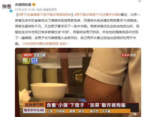 【男子含著蟑螂下館子敲詐商家被拘】最近,北京一起餐飲行業的不良事件引起了公眾關注。一名食客在一家餐飲店中發現蟑螂后,并沒有選擇與商家協商解決,而是采取了不光彩的手段,試圖通過敲詐勒索商家。據了解,該男子含著蟑螂后撥打電話向商家提出10倍賠償的要求。商家在迫于壓力的情況下先是轉賬千元,并按男子要求購買了一條中華煙。隨后,商家意識到問題的嚴重性,將情況及時反應給當地派出所。
