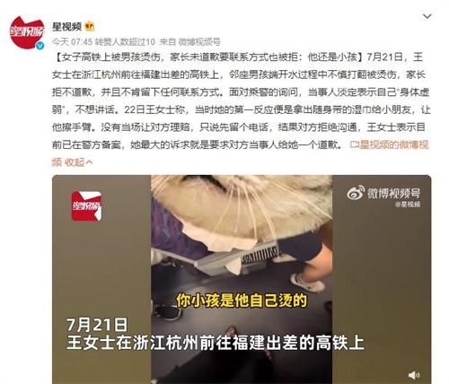 【女子高鐵上被男孩燙傷,家長(zhǎng)未道歉遭拒】近日,一起發(fā)生在浙江杭州前往福建出差的高鐵上的事件引起關(guān)注。乘客王女士在旅途中不幸被鄰座男孩的熱水意外燙傷,然而令她失望的是,男孩的家長(zhǎng)不僅沒(méi)有道歉,還拒絕提供任何聯(lián)系方式。面對(duì)乘警的詢問(wèn),當(dāng)事家長(zhǎng)態(tài)度冷漠,聲稱“他還是小孩”,并不愿意與王女士溝通。