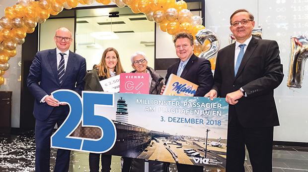 維也納機場取得了新的歷史新高。周一中午,第2500萬名乘客抵達維也納后受到歡迎。