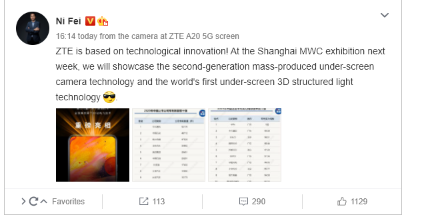 中興通訊業務部總裁兼努比亞技術總裁倪飛在微博上宣布,該公司將在上海世界移動通信大會(MWC)上展示其下一代屏下攝像頭技術。該公司去年推出Axon 20時,就成為第一個使用世界上第一個屏幕下照相手機來祝福我們的公司。