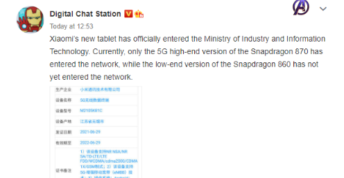 該小蜜彌座5剛剛被一個微博博客,中國的微博網站,發現在中國的中華人民共和國工業和信息化部。該平板電腦將通過高通驍龍870 SoC支持 5G 。