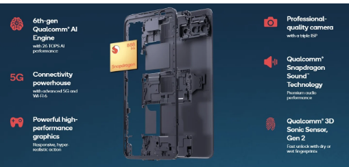 Qualcomm 為這款手機配備雙立體聲揚聲器和智能放大器,是首批支持 Qualcomm Snapdragon Sound 技術的手機之一。支持雙 5G SIM、Wi-Fi 6E、藍牙 5.2、Wi-Fi Direct 和 NFC。它還具有高通 3D Sonic Sensor Gen 2 后置指紋傳感器。掃描儀下方是一個亮起的Snapdragon標志,但我們不知道它是否可定制。