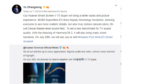 今天早些時候(2021年 7 月 26 日),華為正式宣布將于 2021 年 7 月 29 日推出全新的 Smart Screen V 75 Super。這將是該公司首款配備 Mini LED 顯示屏的電視,并將支持鴻蒙 OS 2.0。