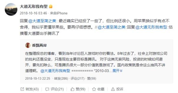 同時(shí)段永平表示既然財(cái)務(wù)投資無(wú)法讓股東獲得大量的收益,但是財(cái)務(wù)也沒(méi)有讓股東決定自己投資的方向,段永平也在社交平臺(tái)多次表示,騰訊城多次對(duì)于重股倉(cāng)進(jìn)行持股已經(jīng)達(dá)到整體持股的14%他也表示騰訊目前帶來(lái)了確定性和不穩(wěn)定因素確實(shí)是比蘋果要小。