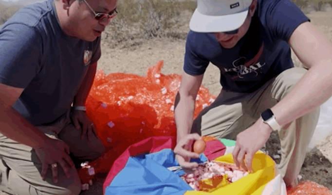 羅哥為了進行這項實驗,開車到達了沙漠的最深處,整整開了6個小時就是為了來創造一下最高的雞蛋跳傘世界紀錄,該團隊時用的是一個零壓力的氦氣球將雞蛋送往遙遠的太空,其實這個飛行過程十分的順利,并且在兩個小時后氣球已經上升到了近3萬米的外層空間只是沒有到達真正意義上的太空。