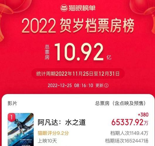 目前2012年的賀歲檔影片已經過去了,一大半的時間,根據數據統計截止到12月24日賀歲檔的總票房已經達到了10億元,截止到12月25日,202年的和隧道,總票房已經達到了10.92億元并且剛剛上映的阿凡達,水之道的票房就突破了6.5億占據了202年賀歲檔票房的60%以上,除了阿凡達誰知道以外名偵探柯南,萬圣節的新娘和航海王鴻發歌姬的票房都突破了億元。