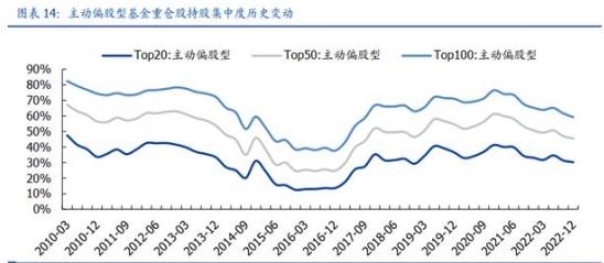 自從2019年公募基金抱團,已經出現了三年的結構性牛市,雖然說出現了不斷的結構性趨勢,但是從2021年開始,基金個股的配置就出現了下降,到了2022年的第四季度持股集中度出現了大幅度的下降,目前個股的抱團行為已經基本消失,根據國盛證券的相關統計,2022年的第四季度末公募前20前50和前100的重倉持股率都出現了下滑,個股層面的持股抱團現象也持續走弱。