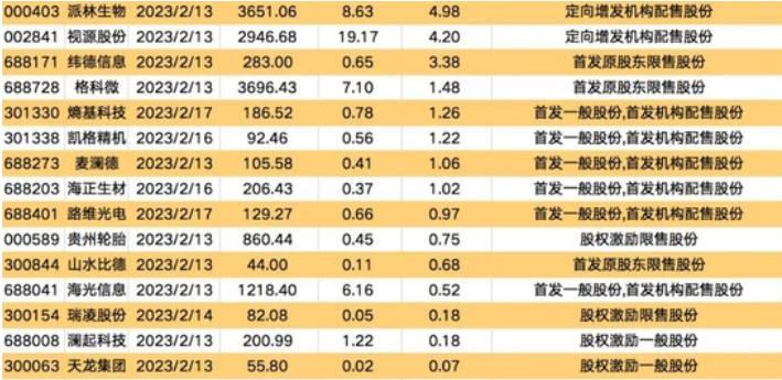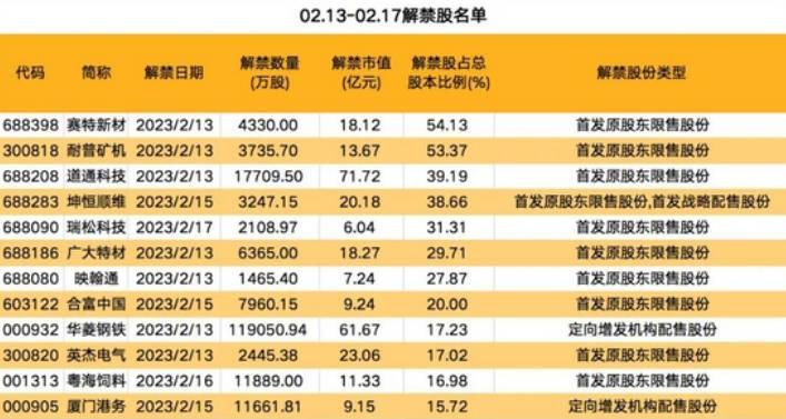 導(dǎo)讀 根據(jù)資料顯示,在2月13日到2月17日,A股市場中將有37家上市公司的限售股票解禁,接近的金額就達(dá)到了430.29億元,此次道通科技。