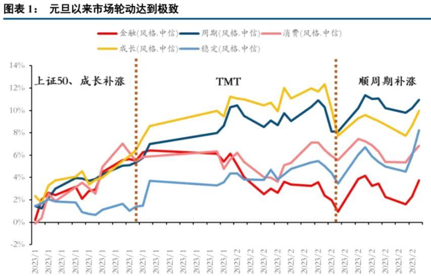 去年底報告提出過未來的很長一段時間內,該機構的投資者習慣找主線的方式在2023年可能并不占據優勢,運動戰將會成為主流的投資方式,這適應了我國目前不斷變動的經濟趨勢。結合市場的邏輯行情和資金面流向,可以把對牛市市場劃分為輪動、普漲以及結構三種表達方式,而目前最典型的就是輪動行情,在市場逐漸從熊市走出的過程中,各大機構都能發揮作用,在引導資金鏈的同時,控制自己的資金投入力度,通過動態觀察保證平衡。
