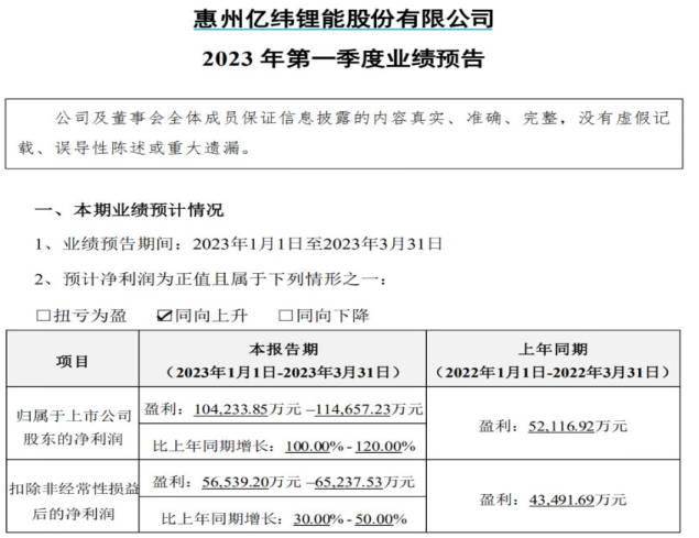 市值已經超過1,300億元人民幣的電池廠億緯鋰能4月9日公布了公司首個季度的業績預,預計該公司在2023年第一季度將會實現的規模利潤值會達到10.42億元人民幣到11.47元人民幣,與同時期相比,會增長100~120%。2022年第四季度碳酸鋰的價格達到歷史上最高點時,億緯鋰能的規模凈利潤值僅有8.5億元人民幣。