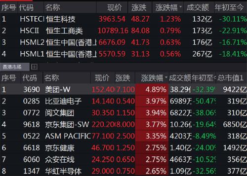 從科技股方面來看,現在小鵬汽車上漲將近6%,東方甄選、美團、中芯國際上漲超2%,閱文集團上漲超過4%,京東集團、海爾智家、網易、快手、騰訊控股上漲超1%,小米集團一度下跌超過3%。