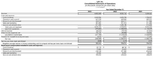 2.2023年Lyft的運營虧損值為美元4.76億,上一年度同時期的運營虧損值是美元14.59億。凈虧損值達到美元3.4億,而上一年度同時期的凈虧損值達到美元15.85億。運營虧損和凈虧損值都有了大幅度的減少。