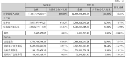 3.根據年報顯示,報告期內東方財富的主要業務分別有金融數據服務業務、金融電子商務服務業務和證券業務等。其中證券業務的營業收入所占的比例為64.92%,實現的營業收入達到人民幣71.94億,同比減少的幅度是8.44%。信息技術服務方面的業務所帶來的營業收入為人民幣38.82億,所占的比例為35.03%,同比減少的幅度是10%。