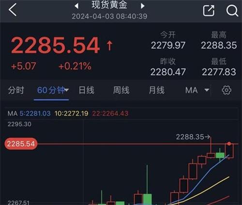 4月3日亞市早盤,黃金現(xiàn)貨繼續(xù)延續(xù)上漲的勢頭,目前黃金的價格已經(jīng)上升到了美盎司2285美元的上方。黃金的價格在稍早的時候曾經(jīng)一度大幅度上漲,達到每盎司2288.35美元,再次創(chuàng)造了歷史新高。