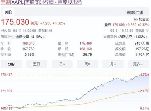 蘋果的股票價格在當地時間4月11日出現了近來非常罕見的大幅度飆升,截止到收盤時,上漲幅度達到4.3%,當天市值的增加量達到1,120億美元,折合成人民幣大約是8,100億。