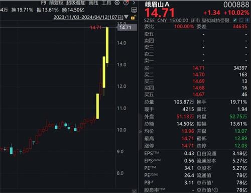 峨眉山A的股性自4月9日以來被激活,在最近的4個交易日當中,有3次實現了漲停,其股票價格從每股10元左右上漲到了每股14元以上。面對峨眉山A如此突如其來的暴漲,市場上有傳言稱在峨眉山的主峰發現了一座金礦,對此峨眉山A及時進行了否認,并且表示峨眉山一直將每一位游客看作像黃金一樣珍貴。