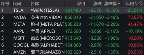 4.美股科技七姐妹全部下跌,其中特斯拉的下跌幅度達(dá)到5.59%,市值蒸發(fā)了,大約304億美元,折合成人民幣大約是2,200億。英偉達(dá)的下跌幅度達(dá)到2.48%,臉書的下跌幅度達(dá)到2.28%,蘋果的下跌幅度達(dá)到2.19%,微軟的下跌幅度達(dá)到1.96%,谷歌的下跌幅度達(dá)到1.82%,亞馬遜的下跌幅度達(dá)到1.35%。