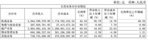 5.從板塊劃分來看,機場業務方面的營業收入同比增長的幅度將近一倍。地產業務方面的收入同比增長的幅度超過了四成。商務和免稅業務的營業收入同比,出現了小幅度的下滑,下滑幅度為0.6%。物業管理業務的收入同比出現了下滑,下滑幅度為2.59%。