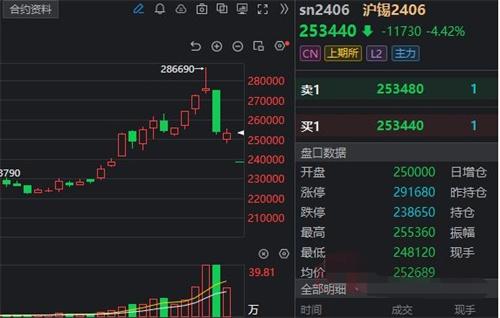 錫的價格自周一時達到每噸286,690元之后,開始持續下跌。4月23日盤中的曾一度接近跌停,目前的價格已經達到每噸255,000元的下方,行情短期的震動幅度超過14%。