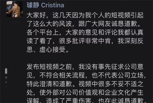 璩靜發布短視頻的初衷是為了能夠把自己的工作做到最好,但是很明顯自己的心太急了,給廣大網友帶來了不適。璩靜在道歉文章中表示自己一定會改正管理方式和溝通方式,糾正自己的錯誤,給同事更多的關心。