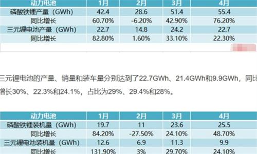 磷酸鐵鋰電池在出口方面所占的比例出現了大幅度的上升。動力電池4月份的出口總量達到12.7GWh,同比增長的幅度達到28.5%,環比增長的幅度達不到3.4%。磷酸鐵鋰電池的出口量水平與三元鋰電池基本上保持持平,都達到了6.3GWh。