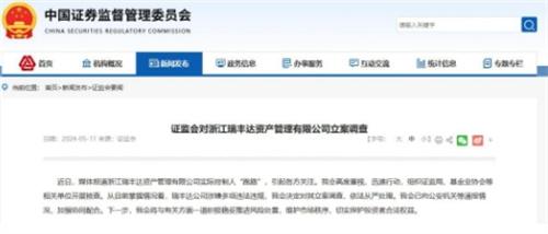 證監會于5月11日晚間發布公告對浙江瑞豐達資產管理有限公司進行立案調查。證監會表示,針對媒體近期所報道的瑞豐達資產的實際控股人跑路的問題,在社會各界引發廣泛的關注,安監會對此也重視,并迅速開始行動,組織基金業協會、證監局等相關單位已經展開了聯合調查。從目前所掌握的情況來看瑞豐達資產確實涉嫌多項違規違法,因此證監會對其進行立案調查,將會依法從嚴進行處理。