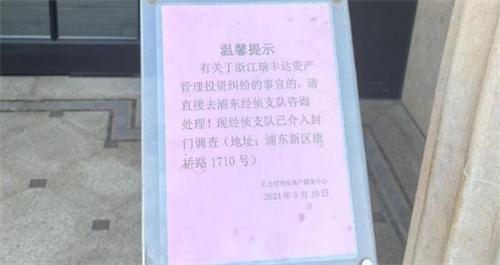 浙江瑞豐達資產管理有限公司位于上海浦東新區的辦公樓在5月10日就已經放置了警示牌。警示牌上表示經偵支隊已經介入進行封門調查。裕豐達辦公區域的大門已經被鎖上了。