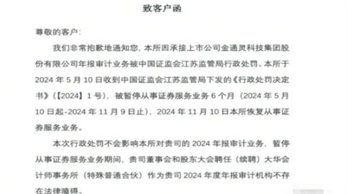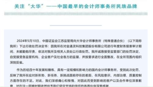 大華會計師事務所于5月13日發表聲明稱收到了江蘇證監局所下發的行政處罰決定書:由于大華所在對金通靈科技進行年度財務報表審計期間涉嫌造假,對大華所及相關人員進行行政處罰。大華所表示會誠懇地接受監管部門的處罰決定,并自覺接受企業客戶、社會各方和各監管機構的監督,全方位的按照要求進行整改,在全所范圍內展開深刻的反省。