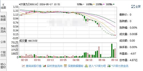 A股最便宜股票*ST保力(300116)的股票價格,雖然在5月16日當天,上漲幅度達到22.22%,但是由于20個交易日連續低于1元,已經觸及到強制退市的條件。深交所決定終止其上市。*ST保力于5月16日晚間發布公告稱從5月17日開市起該公司的股票停牌。