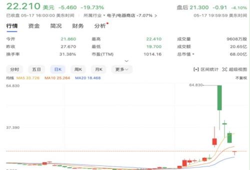 美股散戶抱團概念龍頭股--游戲驛站的股票價格在周五晚上出現了大幅度的下跌。盤中時,其價格下跌的幅度一度超過了28%,截止到收盤時,股票價格下跌的幅度達到19.7%。最新的股票價格與周內價格最高時相比,累計下跌的幅度已經達到65.7%。