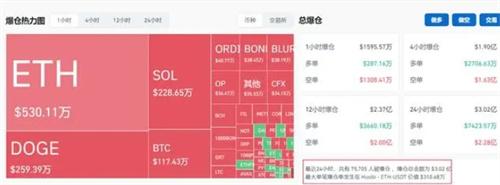 根據(jù)數(shù)據(jù)顯示,最近24小時內(nèi)爆倉的人數(shù)達(dá)到75,738人,爆倉的總金額達(dá)到3.02億美元,合成人民幣大約是21.88億。單筆最大的爆倉單價值高達(dá)310.68萬美元,合成人民幣大約是2,252萬。
