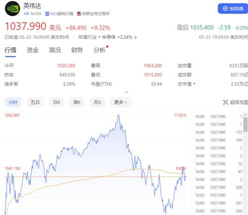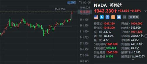 1.英偉達的股票價格截止到5月23日美股收盤時,達到每股1037.99美元,上漲幅度達到9.32%,首次突破了每股1000美元價格,創下了歷史的新。