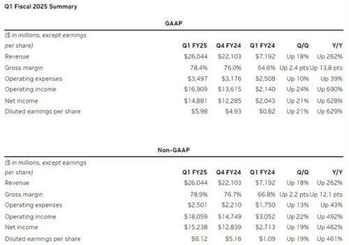 英偉達于當地時間5月22日盤后發布了2025財年第一財季的財報,財報信息顯示,第1季度的凈利潤值高達148.81億美元,同比增長的幅度達到628%,與預期的129億美元的凈利潤相比高出了將近20億美元。 每股的收益是5.98美元,同比增長的幅度高達629%,與預期的5.19美元的收益相比,高出了大約0.8美元。