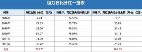 3.恒力石化登錄上交所至今已經有8年的時間,其中有6年進行了分紅,分紅的金額累計達到人民幣223.71億。按照范紅衛、陳建華夫婦手中的持股比例進行計算的話,這6年的時間里,二人共計獲得的現金分紅達到人民幣169.85億。