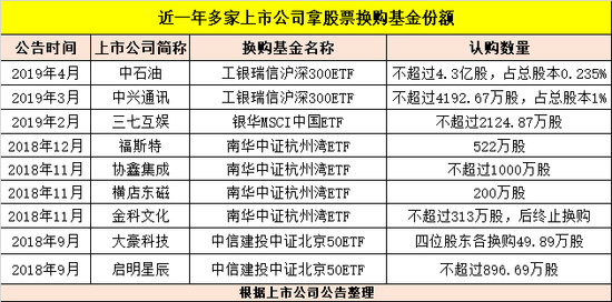 實際上,從去年下半年以來,上市公司拿股份換購ETF的情況比較多,相關(guān)公告密集披露。