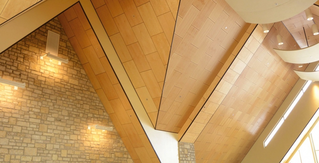 美國(guó)明尼蘇達(dá)州奧瓦通納的Trinity Lutheran教堂,當(dāng)會(huì)眾決定擴(kuò)大規(guī)模時(shí),美學(xué)影響力和出色的音響效果成為當(dāng)務(wù)之急。I&S Group和Twin City Acoustics合作設(shè)計(jì)和安裝了BirdTye maple的WoodTrends Elite吸音木天花板。這些面板由MDF,刨花板或膠合板基材上的木材組成,安裝在標(biāo)準(zhǔn)的15/16英寸網(wǎng)格中,留下3/8英寸的顯示屏。兩層透明的UV固化聚丙烯酸酯涂層可增強(qiáng)天然紋理。除了穿孔的聲學(xué)產(chǎn)品,教堂天花板還包括匹配無(wú)孔的反光板。根據(jù)穿孔模式,Elite面板的降噪系數(shù)值高達(dá)0.90。