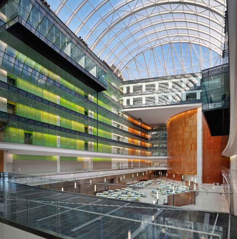 兩個900英尺的機翼配置為聚焦在中庭。這些戲劇性的空間,以及中庭的燈光設施,為辦公樓社區創造了一條主要街道。西端中庭墻和中庭屋頂結構增強了這種效果。