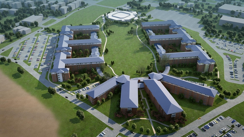 這個占地57,500平方英尺的設施將容納230多張以“吊艙”組成的床位。每個“吊艙”將包含11-12個雙人房,一個單人房供居民助理,兩個共用浴室和一個公共起居區。將在三個相鄰的展館組織吊艙。其中兩個結構將是四層,一層,三層。中央展館將為一樓的所有居民提供公共區域。針對LEED認證,建設于10月開始,該建筑計劃在2013年秋季學期開放。Hardin Construction Co.是該項目的施工經理,Brailsford&Dunlavey是項目經理。