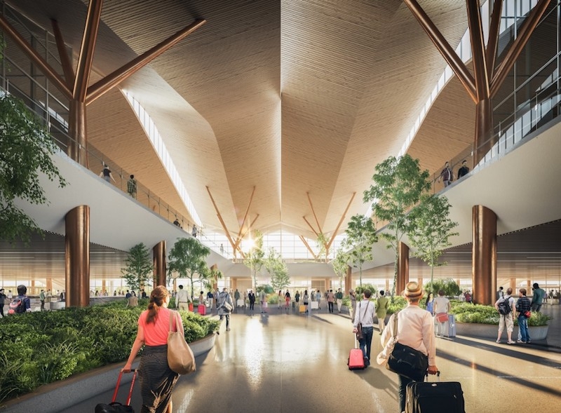 該設計將登記,票務,安全和行李操作整合到一個連接的設施中。雖然在隨后的項目階段仍有變化,但該設計目前為出發和到達的乘客提供單獨的級別,為行李帶等建筑系統提供非公共級別,為擴展的TSA檢查站提供額外空間,為國內和國際乘客提供更短的步行距離,室內和室外綠色廣場和聚集空間,額外的特許和舒適空間,規劃技術改進和更多自動化系統,并強調可持續性。