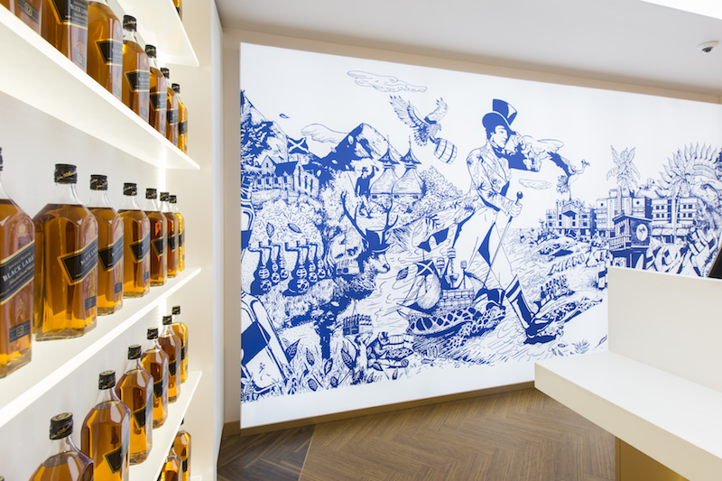在品酒吧,客人可以品嘗各種威士忌,并使用iPad提供有關Johnnie Walker產品的更多信息。此外,還致力于創造博物館般的氛圍,包括彈力織物天花板檐篷,邊緣發光架子和背光產品美化墊。