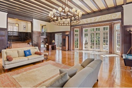 門廳之外是接待圖書館和化妝間。光線充足的餐廳設有法式門。木地板或赤土瓷磚地板、高高的天花板和皇冠造型繼續(xù)貫穿整個 8,189 平方英尺的房子。