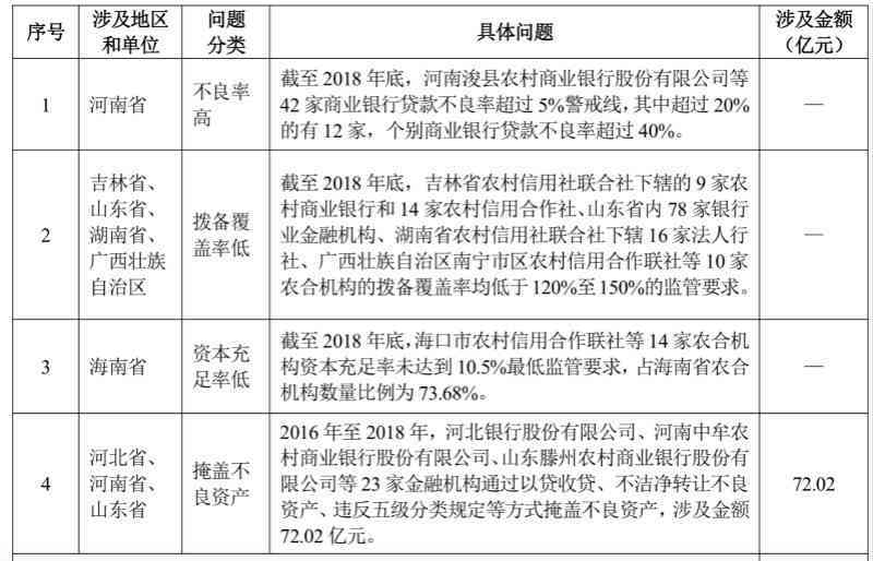 公告稱,目前多數金融機構能夠加強金融風險管控,但仍有包括河南、吉林、山東等7個地區在內的部分地方性金融機構存在不良貸款率高、撥備覆蓋率低、資本充足率低、掩蓋不良資產等問題。