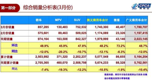 3月份,狹義乘用車銷量為174.03萬輛,同比下降12.1%,但環比增長了48.2%,車市出現回暖之勢。