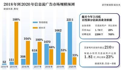 根據第三方研究機構易觀發布的《2019中國信息流廣告市場專題分析》顯示,中國移動互聯網廣告的市場規模增速從2015年的91.6%下降至2018年的29.9%,預計2020年將進一步下降至15.7%。但是,信息流廣告仍保持高增長態勢,2018年其增長速度達到68%,2020年市場規模預計將達到2211億元。